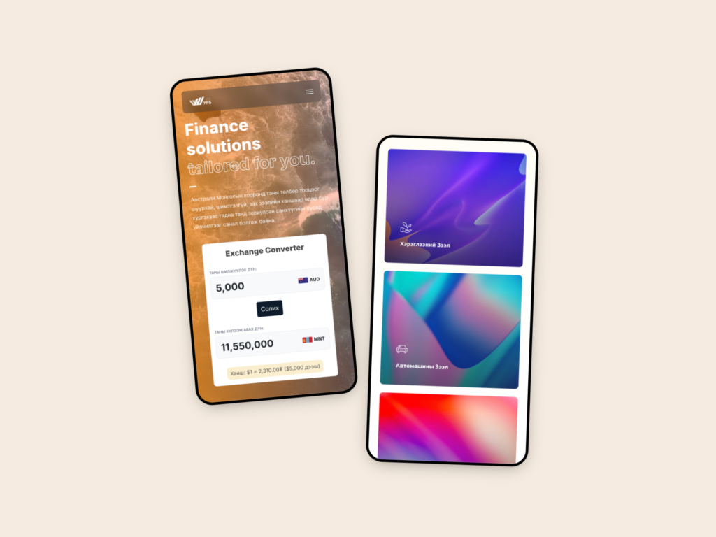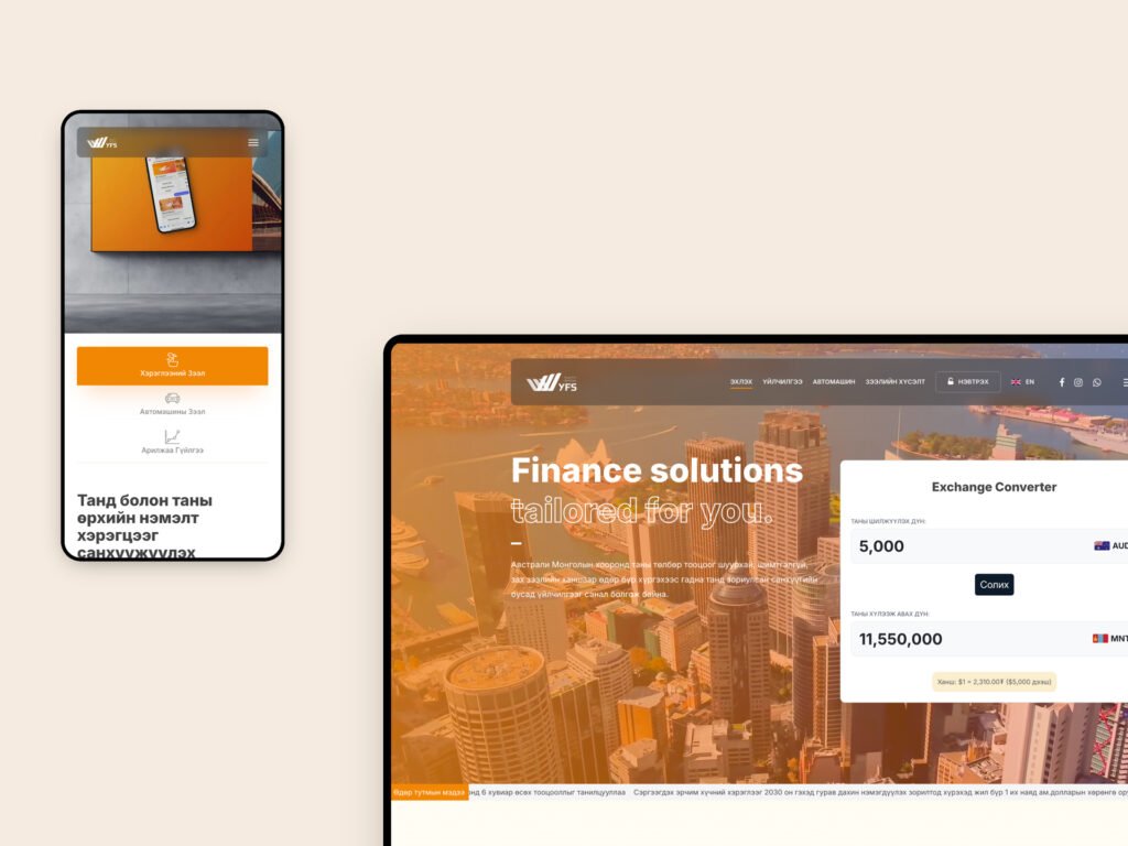 The website clearly presents the company’s core offerings — including consumer and vehicle loans, AUD-MNT exchange, and cross-border remittance — in both English and Mongolian, with mobile-friendly layouts and bilingual content support.