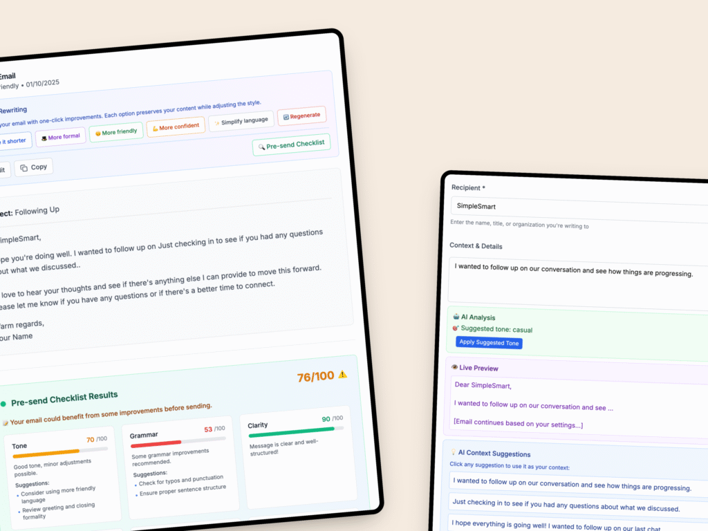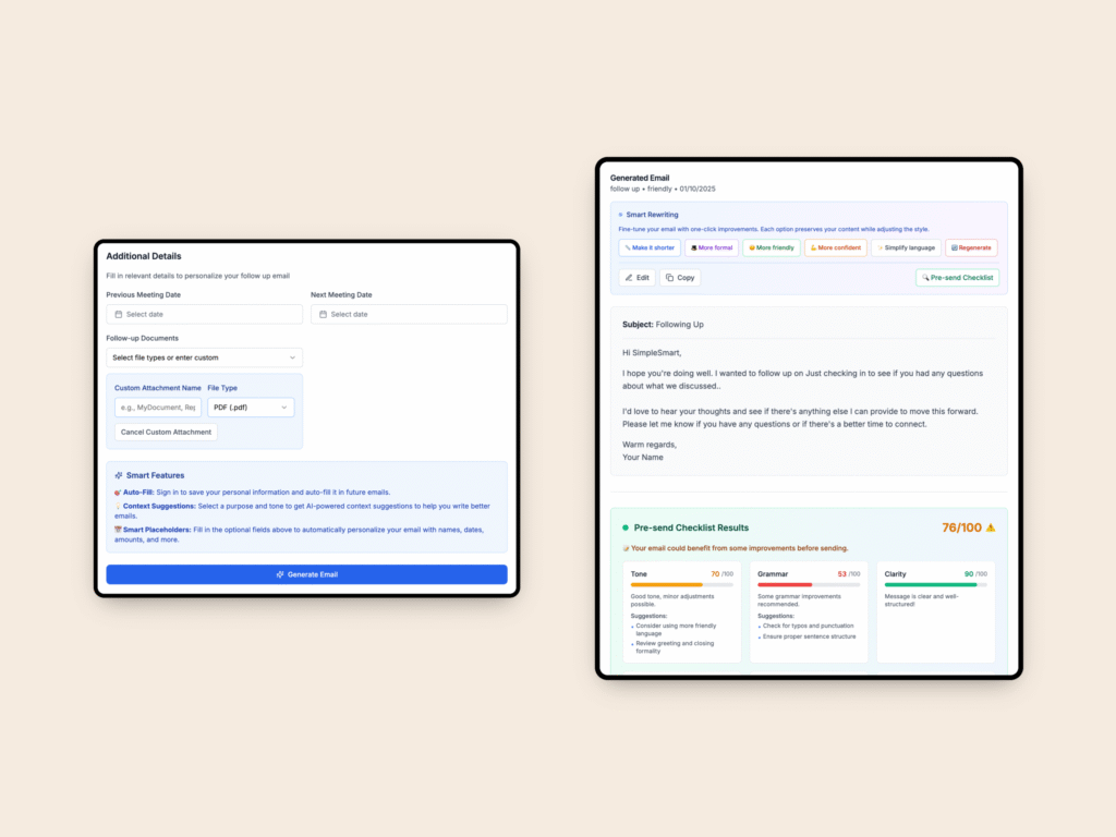 Easily adjust the tone of your email — whether formal, casual, polite, or persuasive — using intelligent tone controls. - Pre-Send Checklist